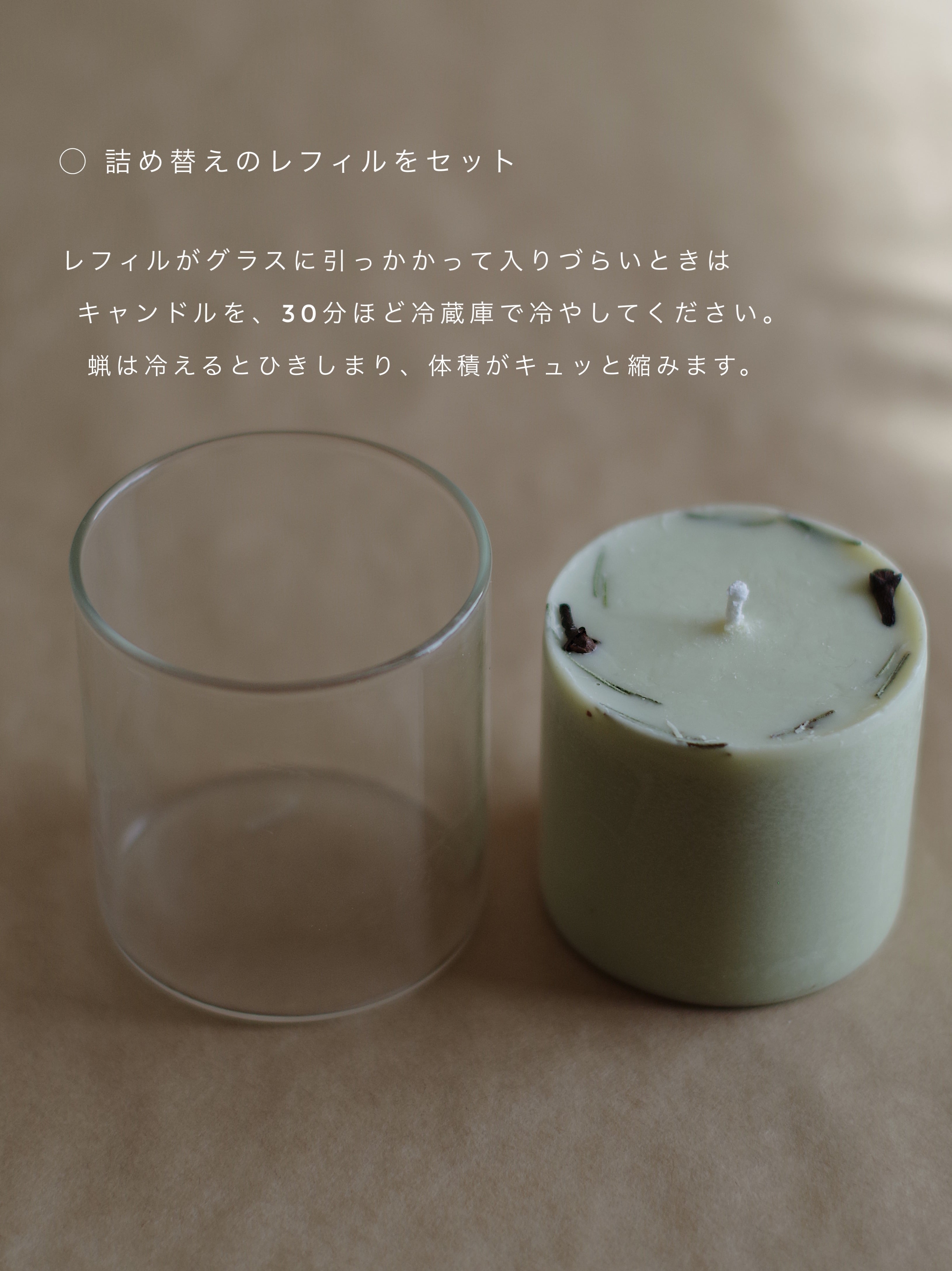 ⚪︎ 詰め替えの際、グラスに引っかかってしまう場合は、レフィルのキャンドルを冷蔵庫で30分ほど冷やしてからセットしてください。